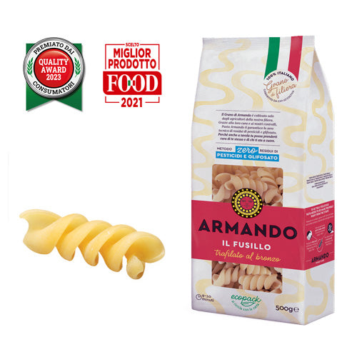 Semola di grano duro 100% italiano della filiera Armando e acqua, trafila ruvida ed essiccazione lenta; solamente due ingredienti lavorati secondo il metodo tradizionale per sapore riconoscibile e speciale.