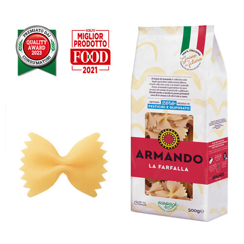 Semola di grano duro 100% italiano della filiera Armando e acqua, trafila ruvida ed essiccazione lenta; solamente due ingredienti lavorati secondo il metodo tradizionale per sapore riconoscibile e speciale.